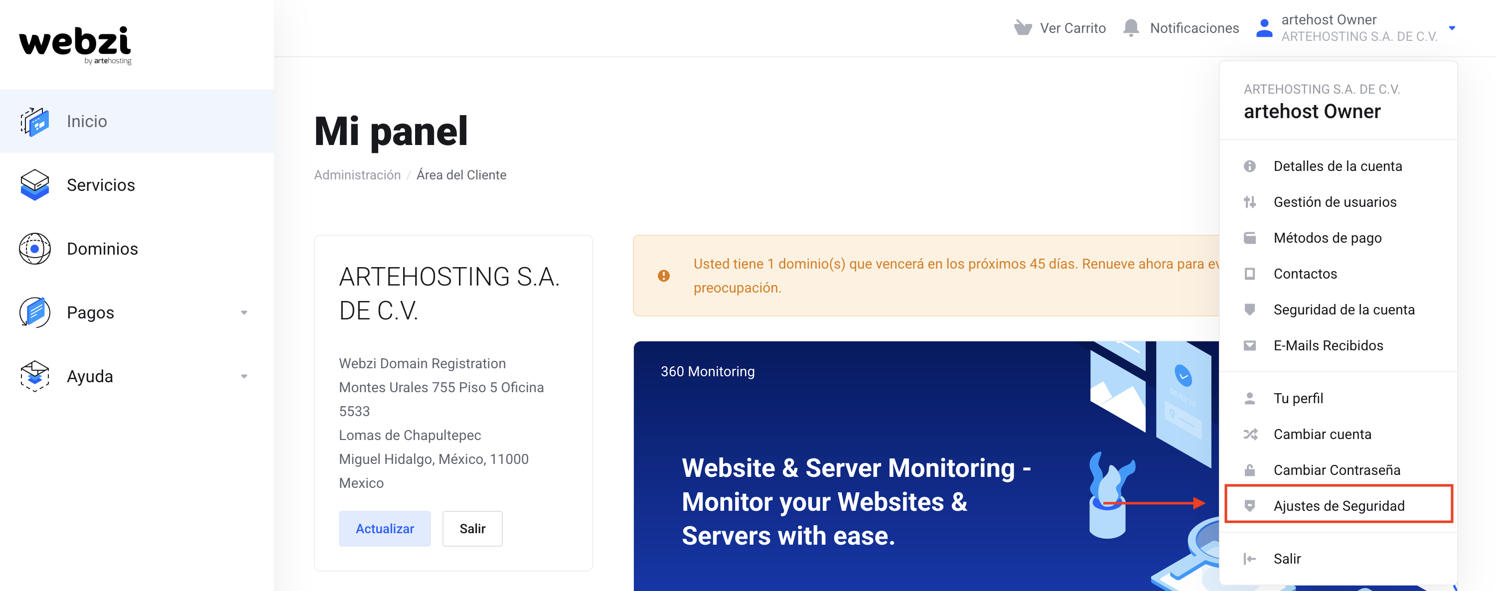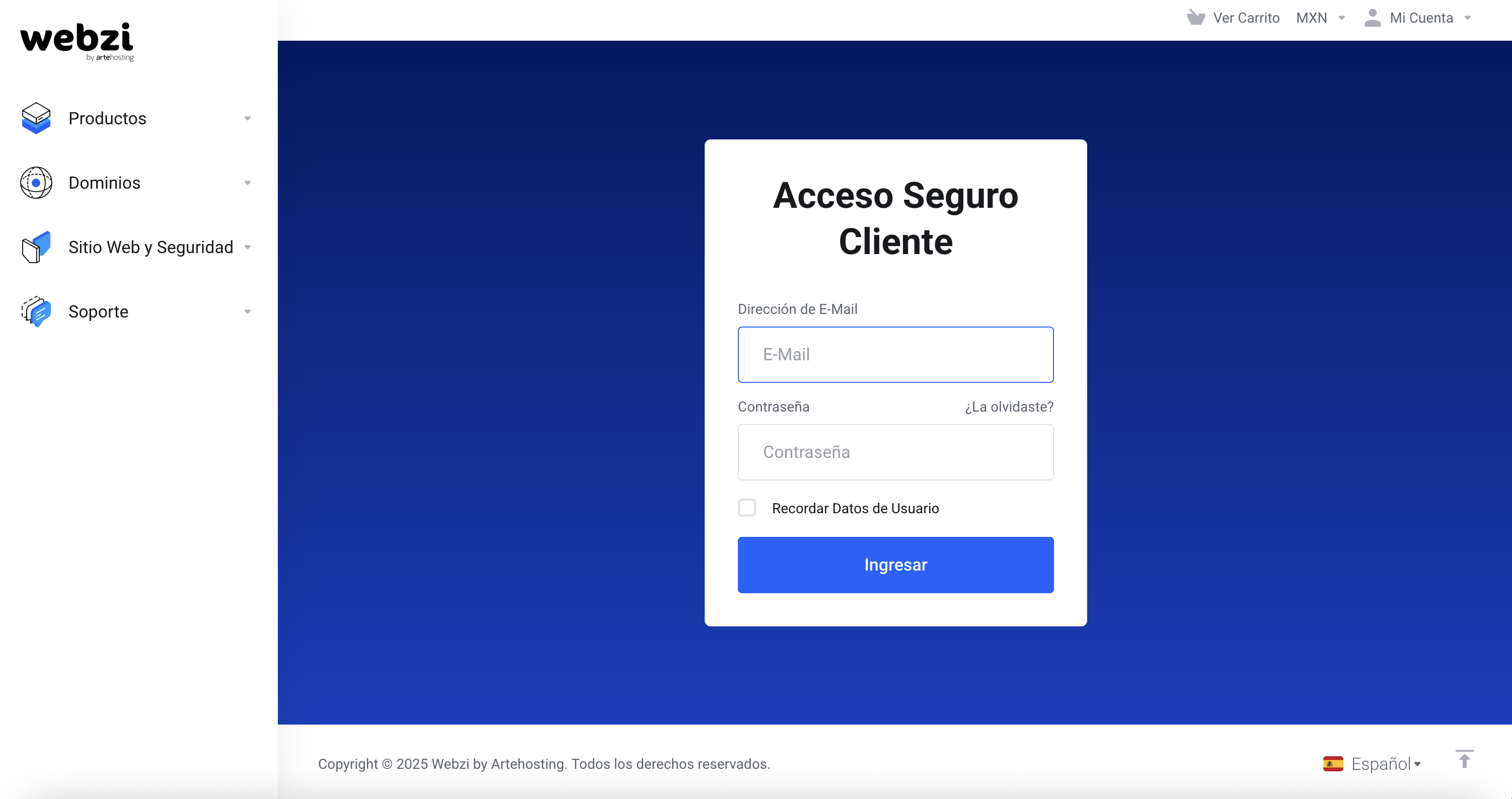 Accede a tu cuenta de Webzi ingresando a https://my.webzi.mx/index.php?rp=/login con tu correo electrónico y contraseña actuales.